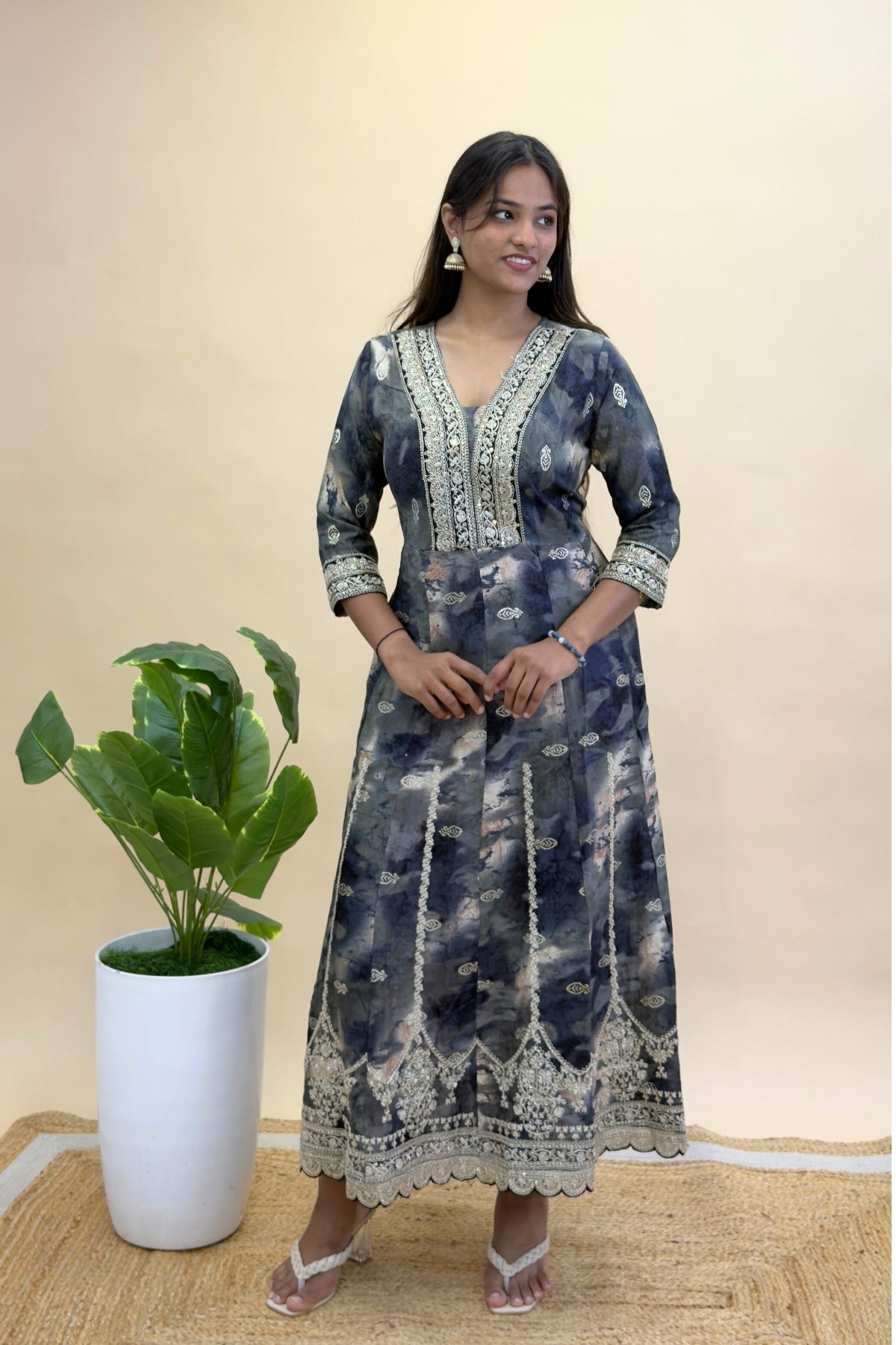 · Features: Heavy rayon fabric for a smooth and flattering fall; golden thread and tikki embroidery on neckline, sleeves & daman; flowy silhouette with elegant flare; lightweight chiffon dupatta for graceful drape